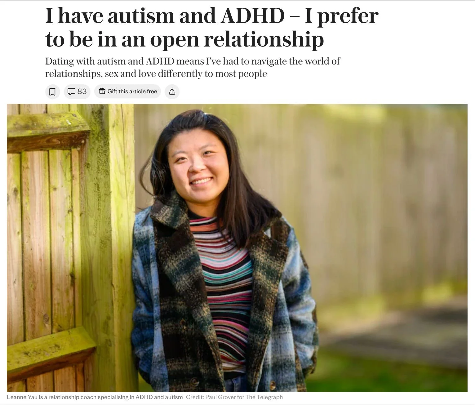 Given that there's such a huge overlap between neurodivergence and polyamory, I've got lots of content on the topic you might be interested in. Most recently, I was featured in The Telegraph talking about my experiences of sex, relationships and polyamory as a person diagnosed with both autism and ADHD!