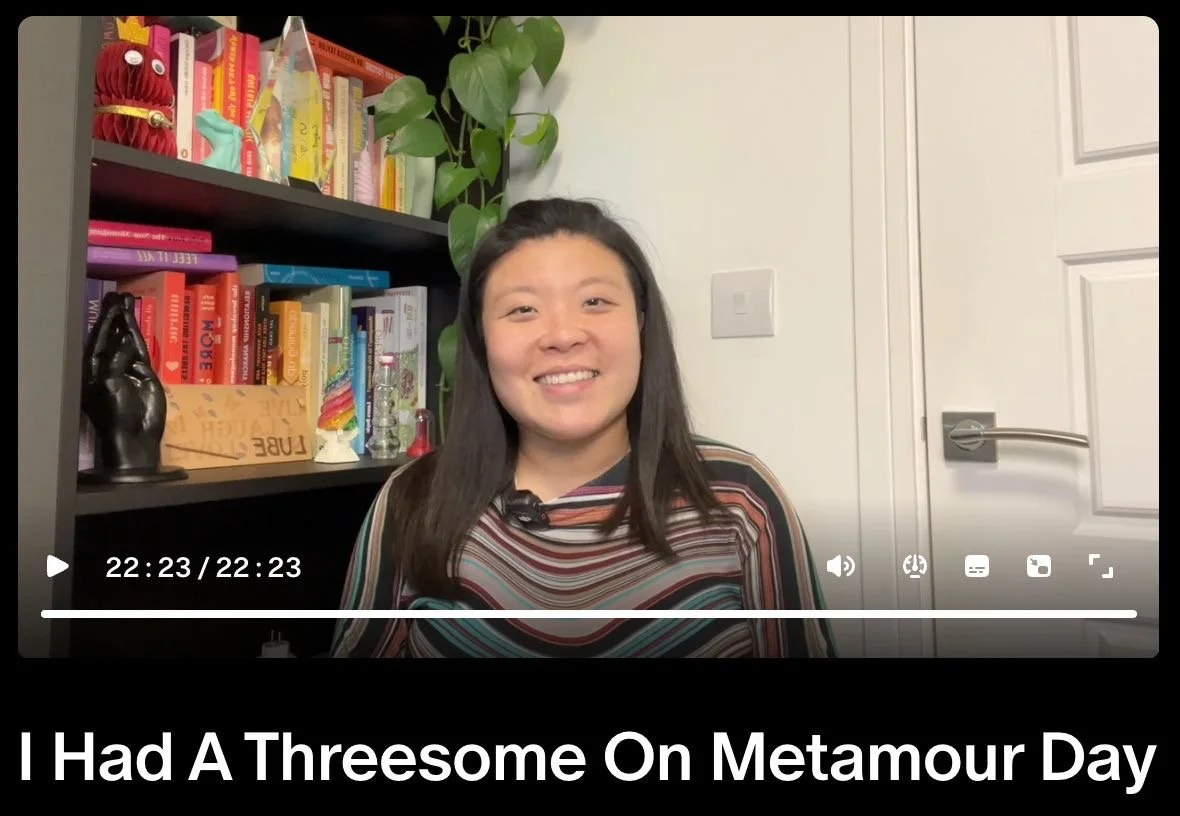 A recent win: I had a threesome with my two partners on Metamour Day, and it was a resounding success! I share a lot of sex stories on my Patreon - past highlights include getting triple penetrated at a 6-person orgy and a bisexual threesome at Pride. And that's just the tip of the iceberg...