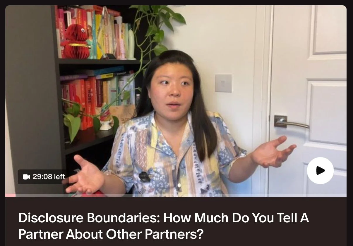 What information can you share with your partner about other connections, and what information is reasonable to ask for? How can you decide how to share information with respect for people's need for privacy without keeping secrets? My latest long-form video is all about disclosure boundaries, where I go in detail about various situations you may run into in non-monogamy and how to deal with them. This half-hour deep-dive is exclusively available on Patreon!